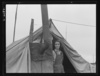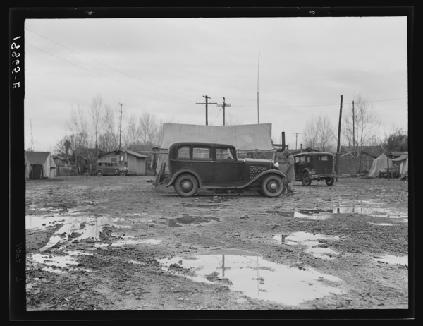 United States government camp for migrants (Farm Security Administration), Farmersville, California. Prefabricated steel dwellings "one step up from a tent" replace the use of tents in the newer California camps