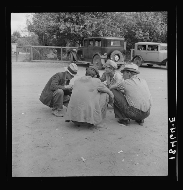 Striking cotton pickers talk it over. The strike is failing. Kern County, California. "I don't care: Let them throw me in jail. There's somebody will take my place"