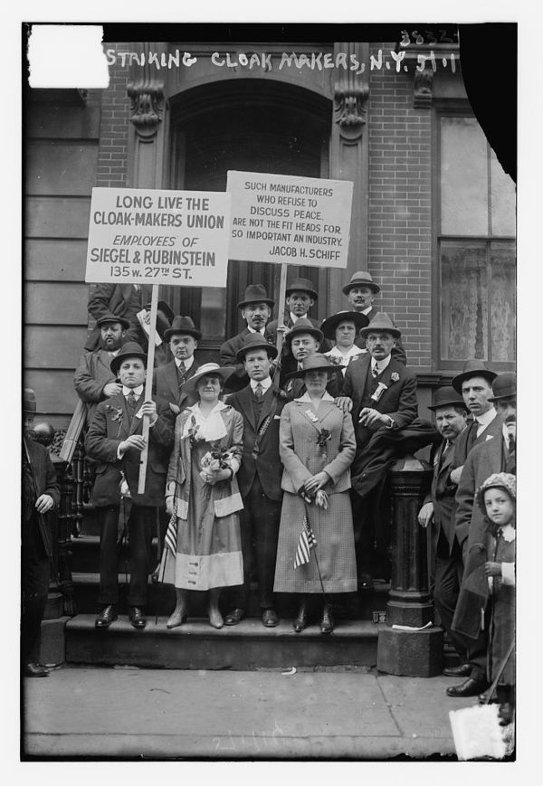 Striking of cloak makers, N.Y., 5/1/16, pickets grouped on steps