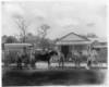 Horse-drawn ice wagon and several persons, two with blocks of ice, standing in street in front of residence