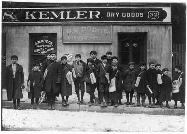 Sunday noon. Some of the newsboys returning Sunday papers. Many of them had been out since 5 and 6 A.M. Hartford, Conn. Location: Hartford, Connecticut.