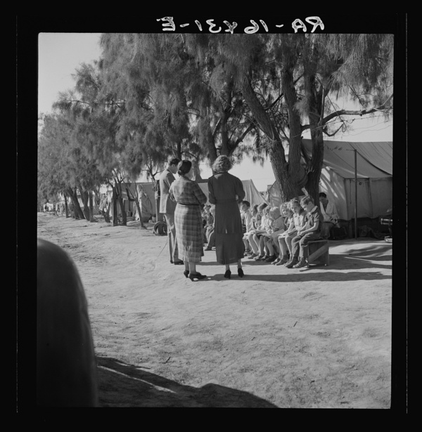 Sunday school for migrant children in a potato pickers' camp. Kern County, California