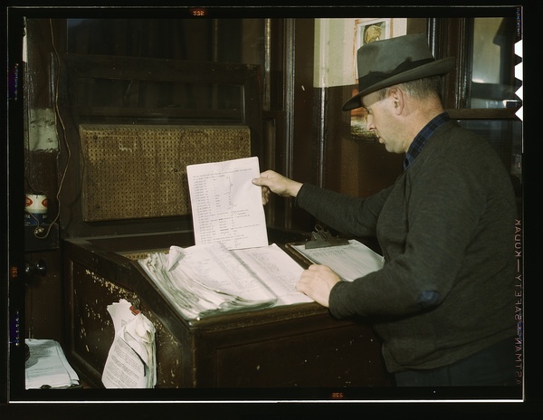 Switch lists coming in by teletype to the hump office at a Chicago and Northwestern railroad yard, Chicago, Ill.