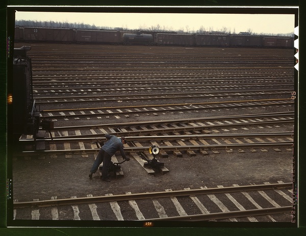 Switchman throwing a switch at C & NW RR's Proviso yard, Chicago, Ill.