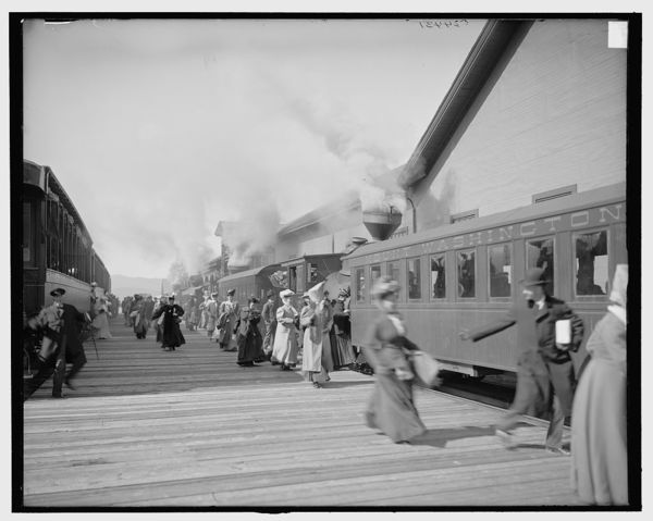 Taking trains of Mount Washington Railway at base station, White Mountains, N.H.
