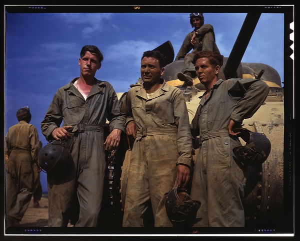 Tank crew standing in front of M-4 tank, Ft. Knox, Ky.