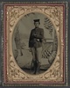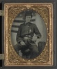Unidentified soldier of "First Scotch Regiment," 12th Illinois Infantry Regiment, in sack coat and Tam o'Shanter cap in front of painted backdrop showing weapons and American flag at Benton Barracks, Saint Louis, Missouri