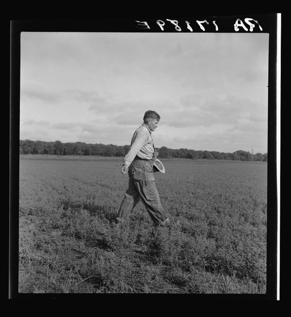 Tenant farmer spreading grasshopper bait in his alfalfa field, five miles from Oklahoma City, Oklahoma
