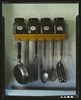 Kitchen utensils hanging below a spice rack with mint, caraway, thyme, and sage jars
