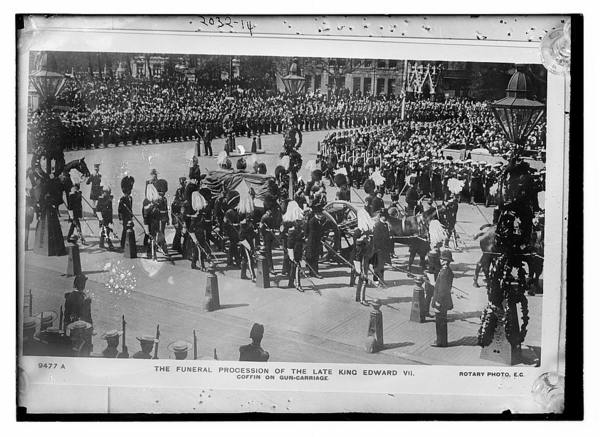The funeral procession of the Late King Edward VII. Coffin on gun-carriage.