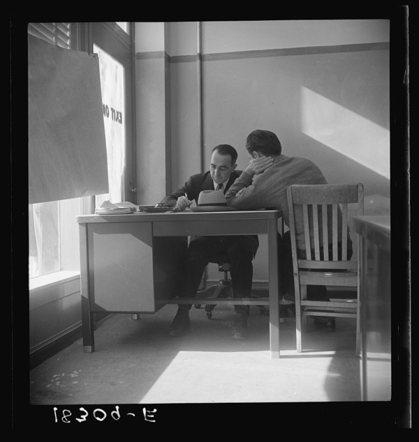 Migrant pea pickers from many states line up with their filled hampers on the edge of the field. They wait their turn for weighing. Near Westley, California