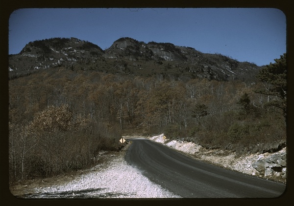 The road along the Skyline Drive, with a light snowfall in the rocks beside, Virginia