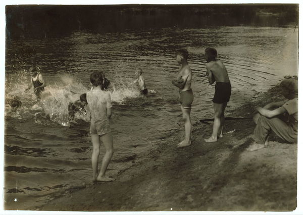 The Swimming Hole. Group of boys - 14 to 16 years - just returned from working in tobacco at Southwick, Mass., on Galpin's farm. Location: Westfield, Massachusetts