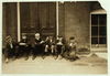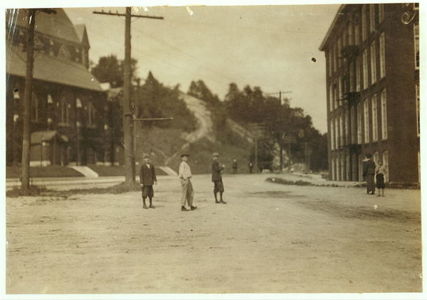 The three boys in centre want to work in Berkshire Mills, at noon, Aug. 30, '11. On August 29 at 6 P.M., Mr. Hine counted ten apparently under 14. Location: Adams, Massachusetts.