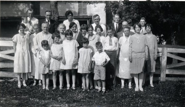 The whole family of W.D. Moore and Alice Hedger Moore with a few cousins and sisters mixed in. Likely around 1926 or 1927 based on Georgia's age.