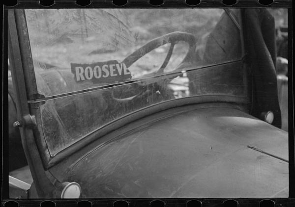 The windshield of a migratory agricultural laborer's car, in a squatter camp near Sacramento, California