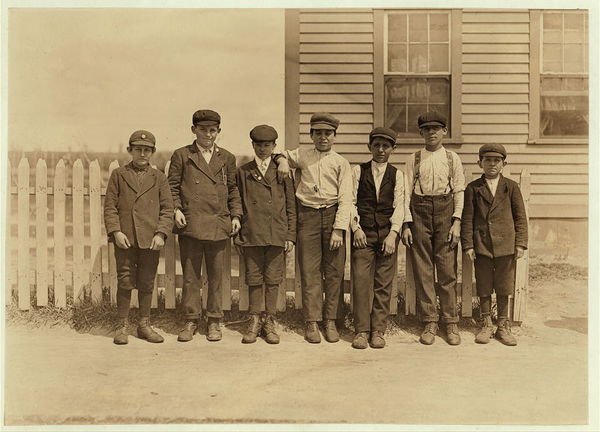 Sweepers and doffers in Royal Mill, River Point, R.I. Boy on right hand end, Frank Jetro has been in mill 3 years. Next Jos. Jetro, nearly 3 years. Next Manuel Ray; 2 years. Next Jo. Jolian; 1 year. Location: River Point, Rhode Island.