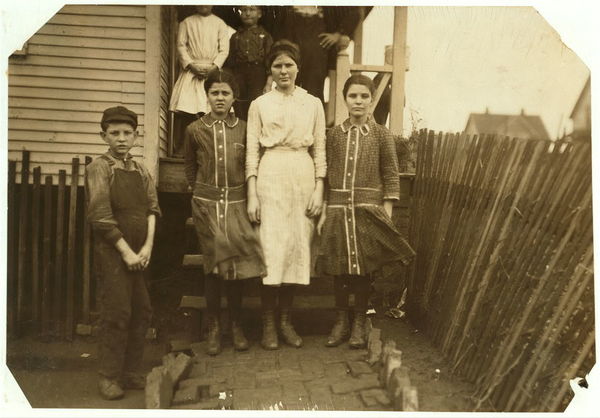 These four children of H.T. Thompson, 267 A Street all work in the Merrimack Mill. The youngest, a girl, has been there three years. See Hine report. Location: Huntsville, Alabama.