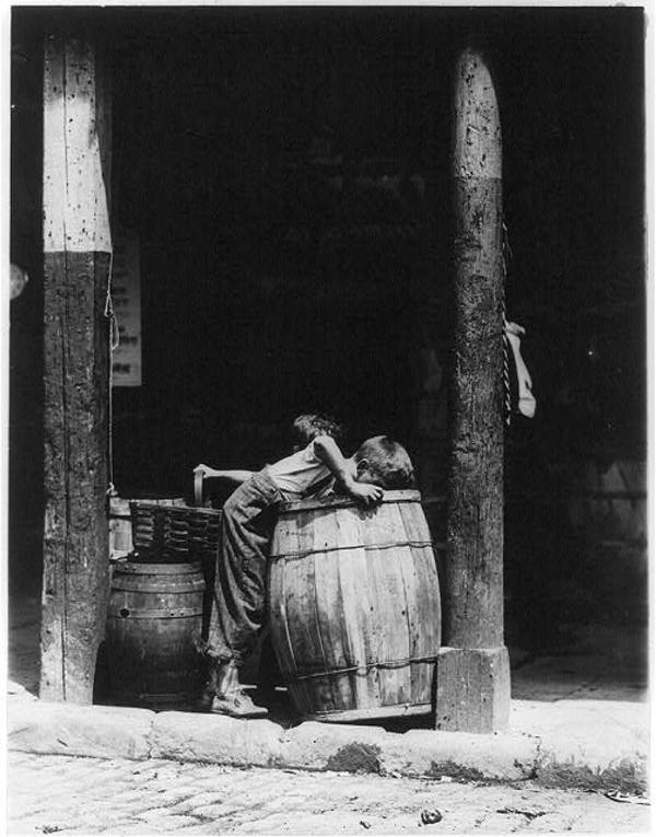 This boy and brother were picking discarded fruit out of barrels in market near 14th St. N.Y. City. He was also (when apparently unobserved) stealing good fruit from their barrels. Location: New York, New York (State)