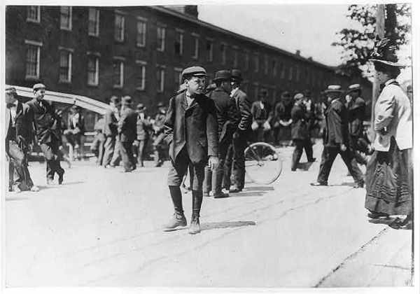 Noon hour, May 26, 1909. These boys and many smaller ones work in Amoskeag Mfg. Co., Manchester, N.H. Location: Manchester, New Hampshire.