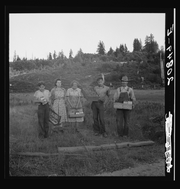 This family, like others in the area, raise strawberries for commercial crop on their small clearings. Shown coming out of the field in the evening. Near Tenino, Thurston County, western Washington
