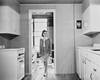 The need for efficiency housing during war-time created super-simple kitchens. Here we see a defense worker coming home to her efficiency kitchen