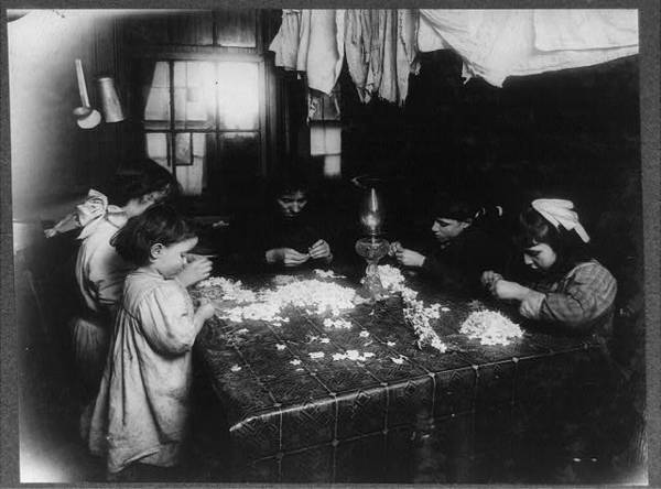 A Night Scene (Photo by 9:00 P.M.) Flower making. Family of Mary Bezzola, 212 Sullivan St., N.Y. George (10 years old) and Levia (9 years old) work until 9:00 P.M. when work is rushing. Location: New York, New York (State)