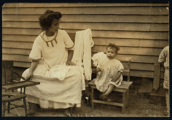 This is typical of the home work on underwear in these quarters. Mother and children and surroundings all filthy. 4 Me Culphe Place, Somerville, Mass. Location: Somerville, Massachusetts.