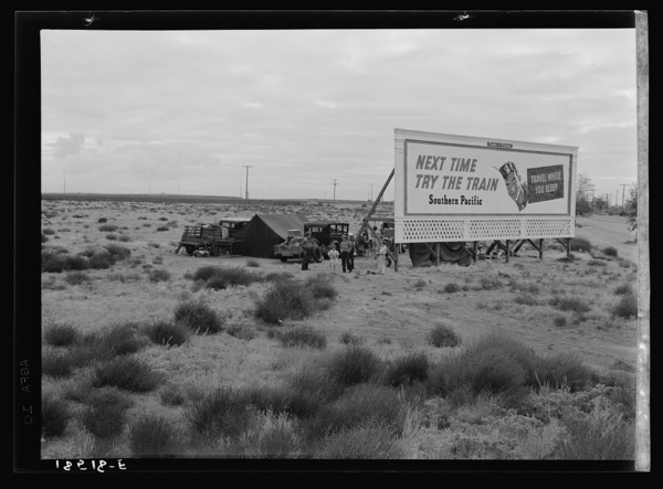 Three families camped on the plains along U.S. 99 in California. They are camped behind a billboard which serves as a partial windbreak. All are in need of work