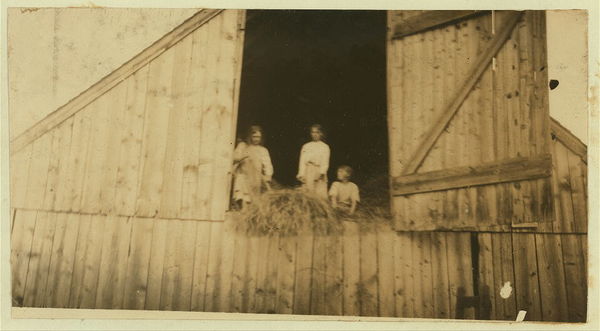 Three Saunders children, nine, eleven, and thirteen years old, mowing away the grain. See Hine Report, Rural Child Labor, August 1915.