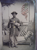 Unidentified African American soldier in Union uniform with a rifle and revolver in front of painted backdrop showing weapons and American flag at Benton Barracks, Saint Louis, Missouri