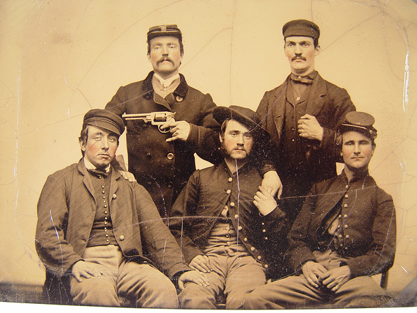 Three unidentified men in Union uniforms and two unidentified men, one pointing a revolver at another's head