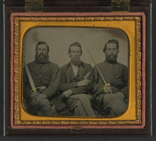Two unidentified soldiers in Union uniforms in front of painted backdrop showing military camp scene