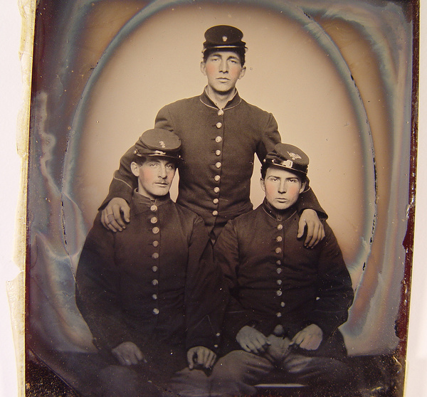 Three unidentified soldiers in Union uniforms and Company E, 8th Regiment forage caps