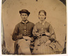 Unidentified soldier in Union uniform and hat and unidentified woman in patterned dress