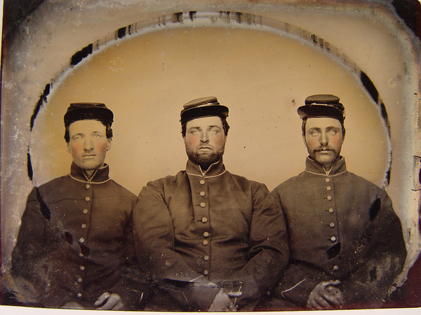 Three unidentified soldiers in forage caps with musket, probably Union uniforms