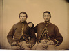 Three unidentified young soldiers in uniforms with shotguns, musket, and pipes in a field with a fence in the background