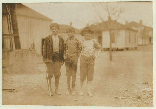 Three youngsters in Avondale Mills. Boy in middle, John Douglas said, "I've been to school my eight weeks. Work now. Been workin' a year." (None of them, even the tiniest, would admit being under twelve.) Location: Birmingham, Alabama.
