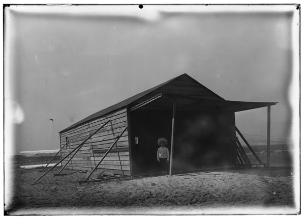 Tom Tate in front of camp building at Kitty Hawk, North Carolina