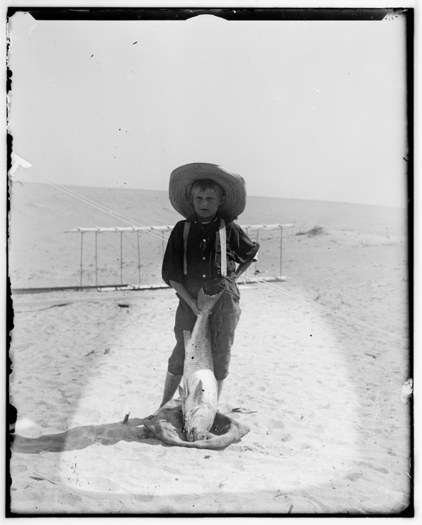 Tom Tate, son of Captain Tate's half-brother Daniel Tate, posing with a drum fish in front of 1900 Wright glider