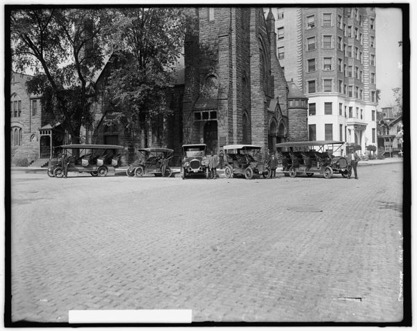 Tourist buses in front of church with Hotel Tuller at right, Detroit