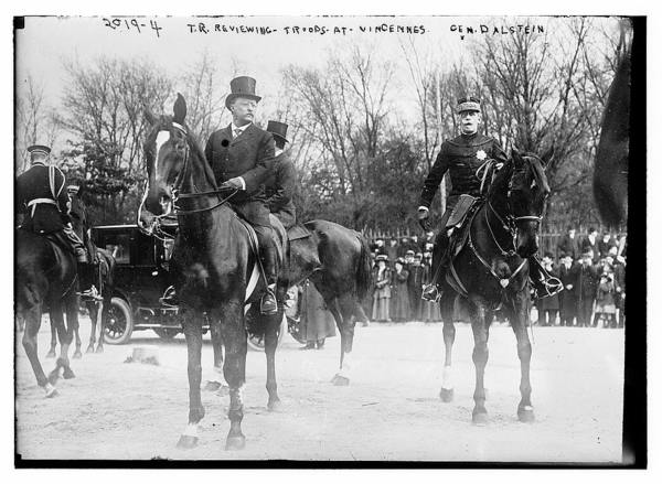 T.R. Theodore Roosevelt reviewing troops in Vincennes. Gen. Dalstein on right