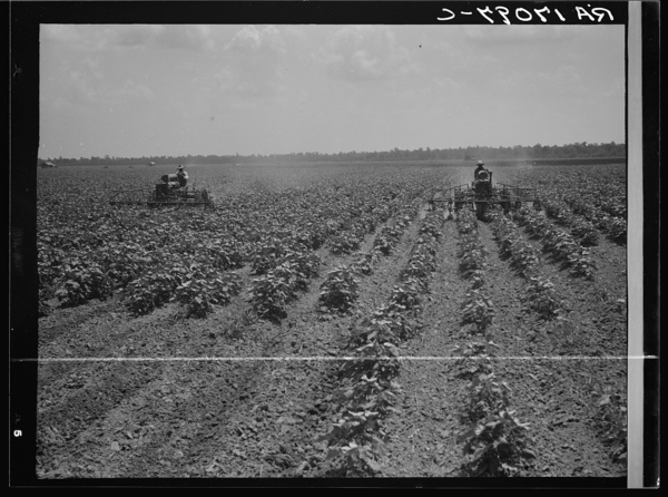 Tractors cultivating cotton. Twenty-two tractors have replaced 130 tenant families on the Aldridge Plantation, near Leland, Mississippi