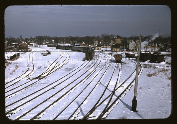 Train and several sets of railroad tracks in the snow, Massachusetts