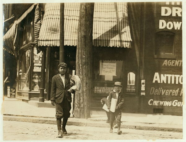 Two newsies selling in P.M. Grand Avenue. May 9th, 1910. Location: St. Louis, Missouri.