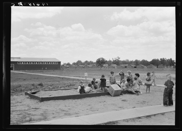 Tulare County, California. Farm Security Administration (FSA) camp for migratory agricultural workers. Nursery school children with their teacher, who is assigned to the camp by Works Progress Administration (WPA). Steel shelters in background
