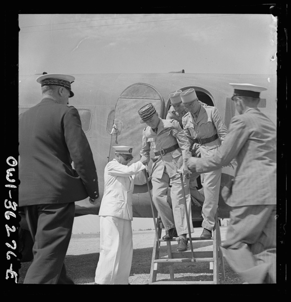 Tunis, Tunisia. General Mast arriving at the Tunis airport to assume his duties as the new resident general of Tunisia. He is still recuperating from injuries received in a plane crash