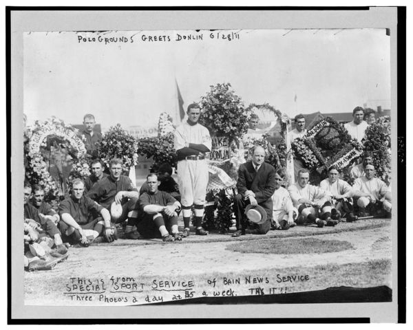"Turkey" Mike Donlin, baseball player for the New York Giants, standing, (center) is celebrated by the members of his team and manager John McGraw, kneeling (center)