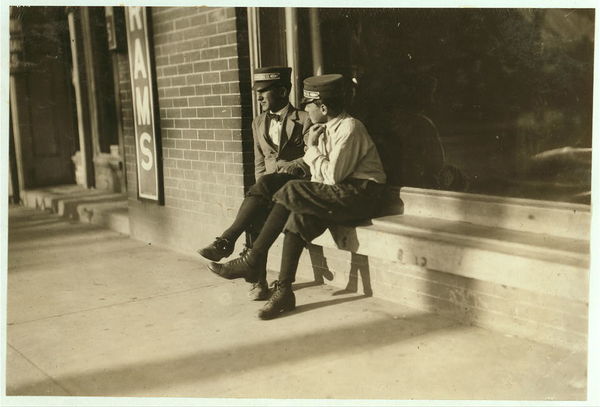 Two Beaumont messengers, 14 and 17 years old. The latter has been messenger here for 2 years. Works until midnight. The Red Light District flourished here. Location: Beaumont, Texas.