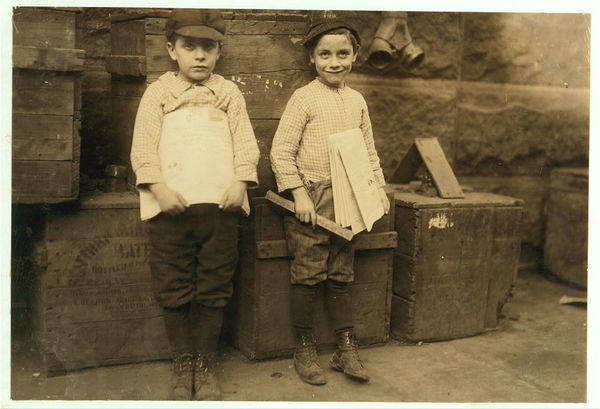 Two of the very youngest newsboys I could find in New Orleans. Seven and nine years old. Such little fellows are rare. Location: New Orleans, Louisiana.